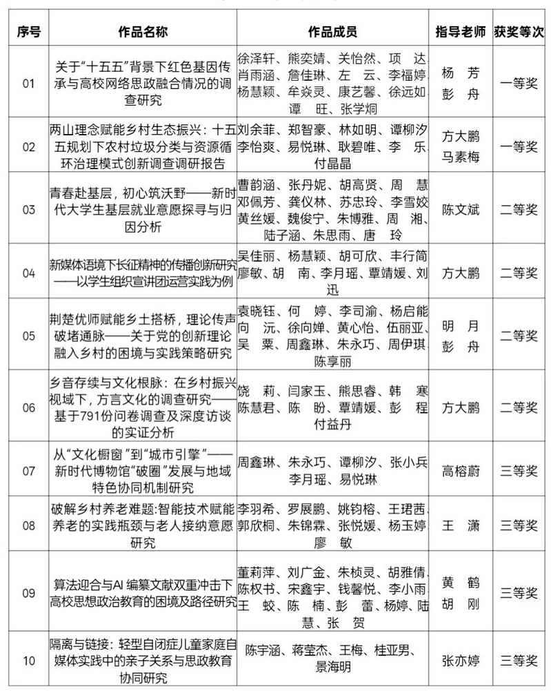 在先进集体表彰中,学院团委被评为“优秀组织单位”;在先进个人方面,陆祎等25名同学被评为优秀实践队员;在实践成果方面,《关于“十五五”背景下红色基因传承与高校网络思政融合情况的调查研究》等1O篇调研报告获评“优秀社会调查报告”。