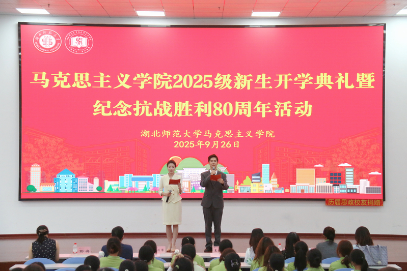 9月26日下午14:00,湖北师范大学马克思主义学院2025级新生开学典礼暨纪念抗日战争胜利80周年主题活动于人文楼达成大讲堂隆重举行。马克思主义学院党委书记李洁,校科学研究发展院院长、马克思主义学院院长唐兴军,院党委副书记彭舟,副院长杨金平、王振钰,教师代表,2025级全体研究生、本科生及2024级本科生代表共同参与。活动由2024级本科生韩维怡、郑智豪主持,以青春之声串联起传承与奋进的篇章。