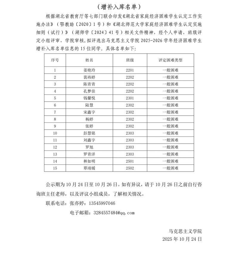 马克思主义学院 2025-2026 学年经济困难学生信息库公示
