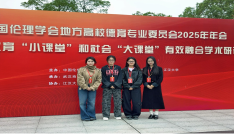 11月7日—9日,由中国伦理学会地方高校德育专业委员会、武汉商学院、江汉大学联合主办的中国伦理学会地方高校德育专业委员会2025年年会暨思政教育“小课堂”和社会“大课堂”有效融合学术研讨会在武汉商学院成功举办。来自北京大学、武汉大学、天津大学、湖北师范大学等高校150多位专家学者以及思政课教师、马克思主义理论研究生与会研讨交流。我院24级研究生朱亚萍、易妍彧、黄依、陈春丽等四位研究生应邀以文参会,并在研究生分论坛分别进行成果汇报。