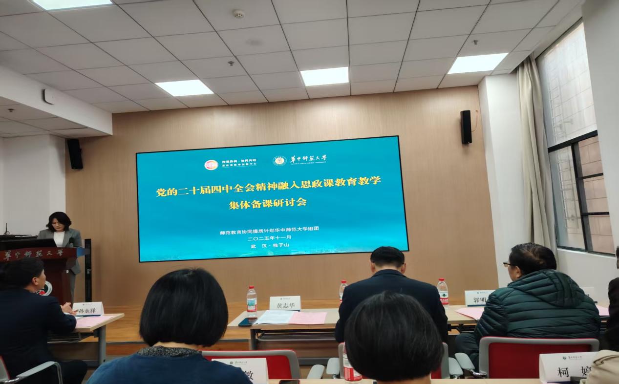 (本报讯) 2025年11月15日,荆楚大地秋意正浓,学术交流热情不减。为深入学习、贯彻落实党的二十届四中全会精神,并推动其融入思想政治理论课教学体系之中,华中师范大学组织开展党的二十届四中全会精神融入思想政治教育教学集体备课研讨会。我院习近平新时代中国特色社会主义思想教研室(以下简称“教研室”)全体教师参与此次教研活动。在专题研讨与交流环节,陈智会老师做主题发言。此次跨校教研活动不仅是一次思想的碰撞与智慧的汇聚,更是一次校际协同、共谋思政育人新篇的生动实践,取得了丰硕成果。