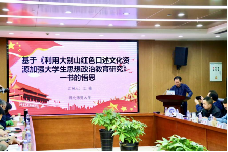 会议期间,宜春学院李霞教授、湖南民族职业学院王永教授、岳阳职业技术学院田犇教授、“守护好一江碧水”管理服务中心王骏阳主任、湖南理工学院粟锋副教授等专家学者分别发表主旨演讲。我院江峰教授在第一场主旨发言中作了“利用大别山红色口述文化资源加强大学生思想政治教育研究”的主旨报告,基于《利用大别山红色口述文化资源加强大学生思想政治教育研究》一书谈了九点悟思。