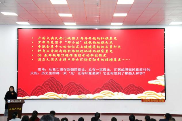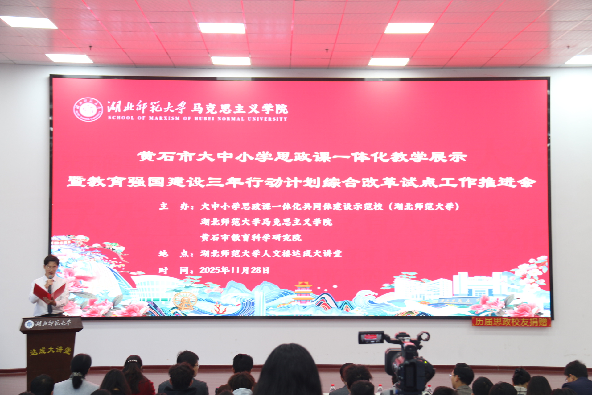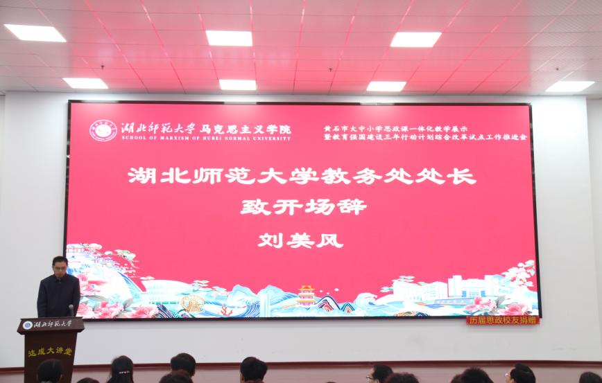1128日上午,黄石市大中小学思政课一体化教学展示暨湖北师范大学立德树人机制综合改革试点工作研讨会在湖北师范大学人文楼达成讲堂举行。出席此次会议的有中共黄石市委教育工作领导小组秘书组秘书科负责人夏水平,黄石市第七中学校长李彩龙、第十四中学校长夏斌、广场路小学校长刘莉、中山小学校长王志娟,黄石市教科院政治教研员陈丽萍、马海平、叶婷、张婷,同时我校教务处处长刘美风,科学研究发展院院长、马克思主义学院院长唐兴军,马克思主义学院党委书记李洁、副书记彭舟,副院长王振钰,教学督导吴瑞霞,以及马克思主义学院教师代表、学生代表共计100多人参加。本次大会由24级本科生郑智豪主持。