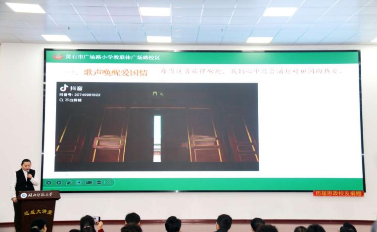 随后,大中小学思政课一体化教学展示环节有序开展。展示按“小学—初中—高中—大学”学段依次推进,教师们围绕“爱国主义”主题开展现场教学:黄石市广场路小学曾莹带来《天下兴亡 匹夫有责》,第十六中学胡蝶讲授《以爱国主义为核心的民族精神》,第七中学熊星呈现《精神铸舰,血脉赋能——福建舰,驶向民族复兴的钢铁巨澜》;湖北师范大学教师陈智会、22级思政专业学生黄良涛分别以《“爱国三问”的新时代之答》《以行动护统一,以同心筑团结——新时代大学生的爱国答卷》为题展示。各学段教学既彰显学段特色与育人理念,又实现教学目标精准定位与育人要求梯度提升。