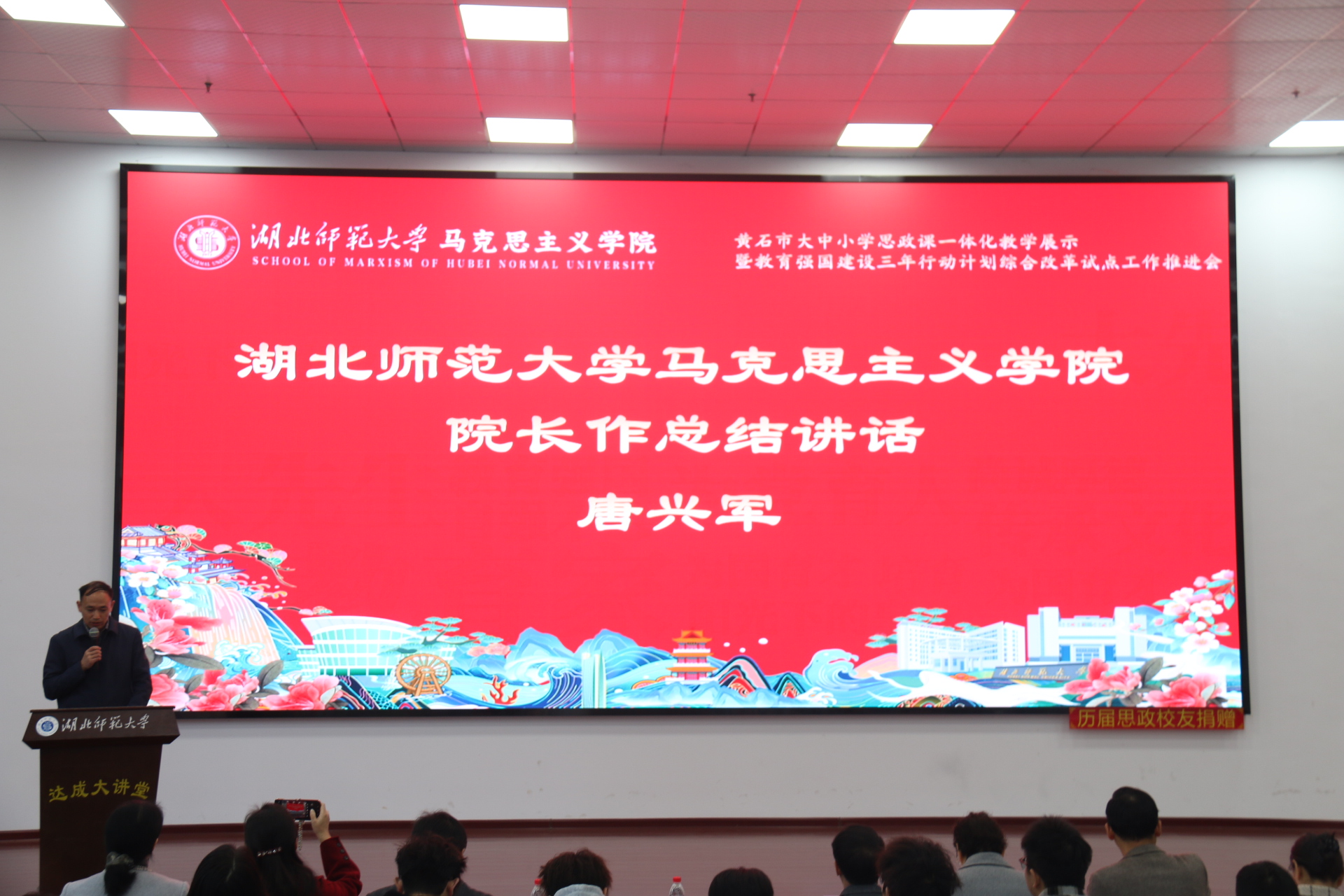 最后,湖北师范大学马克思主义学院院长唐兴军作总结讲话。他全面回顾了本次活动的整体成效与核心亮点,系统梳理了大中小学思政课一体化建设的实践经验,精准指出了当前工作的优化方向,着重强调了校外实践基地与校外实践导师在立德树人机制综合改革试点中的关键支撑作用,并明确了后续深化校地协同、完善育人链条、推动思政教育一体化高质量发展的具体工作计划。