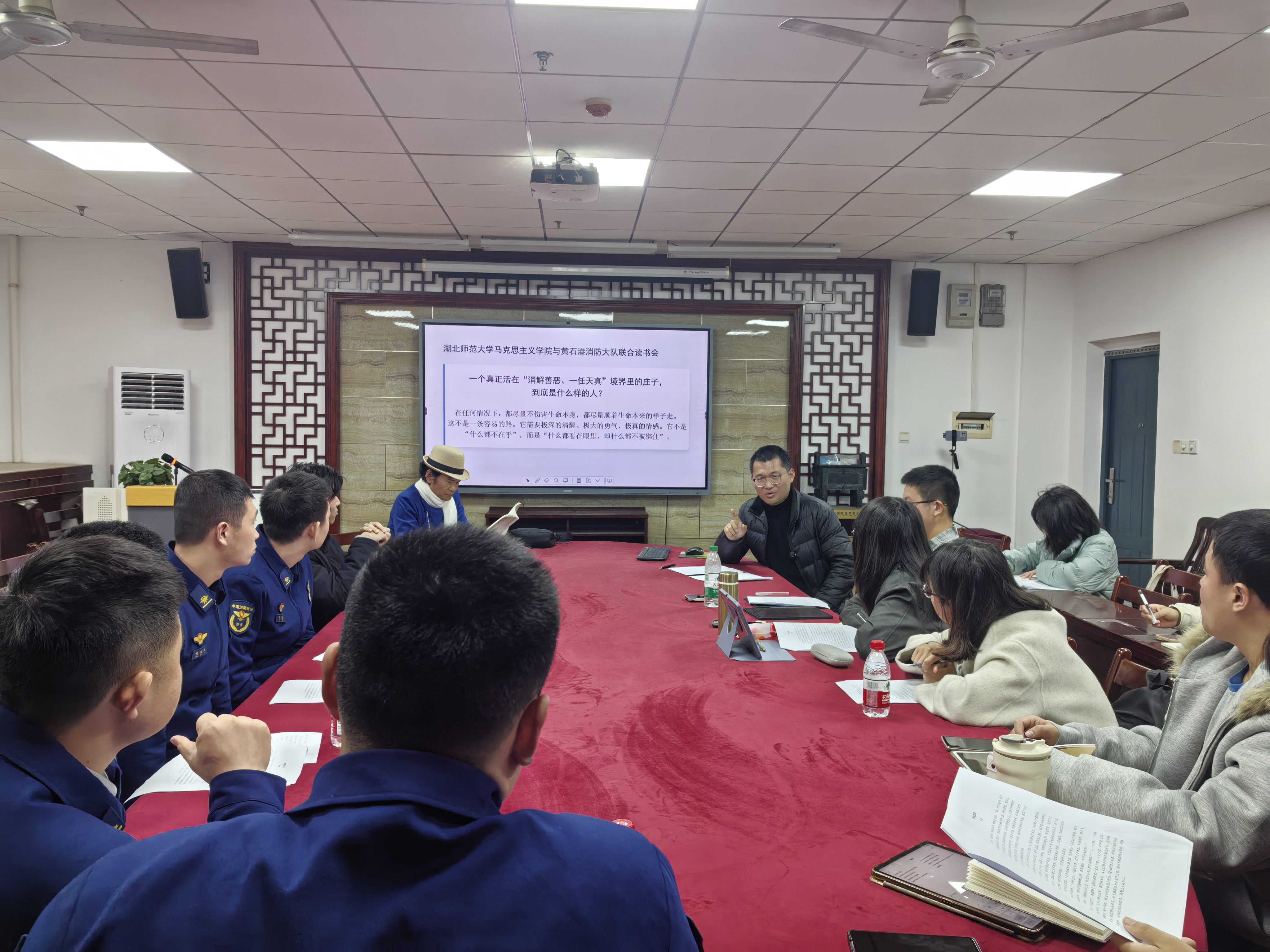 2026年3月8日(周日)14:00-16:00,湖北师范大学马克思主义学院、黄石港区消防救援大队,在人文楼B207联合举办第一次传统经典读书会,消防大队队员及学校本科生、研究生一起研读《庄子·养生主》,马克思主义学院院长唐兴军、教师黄造煌参与其中,大大提升了读书会的档次和讨论深度。