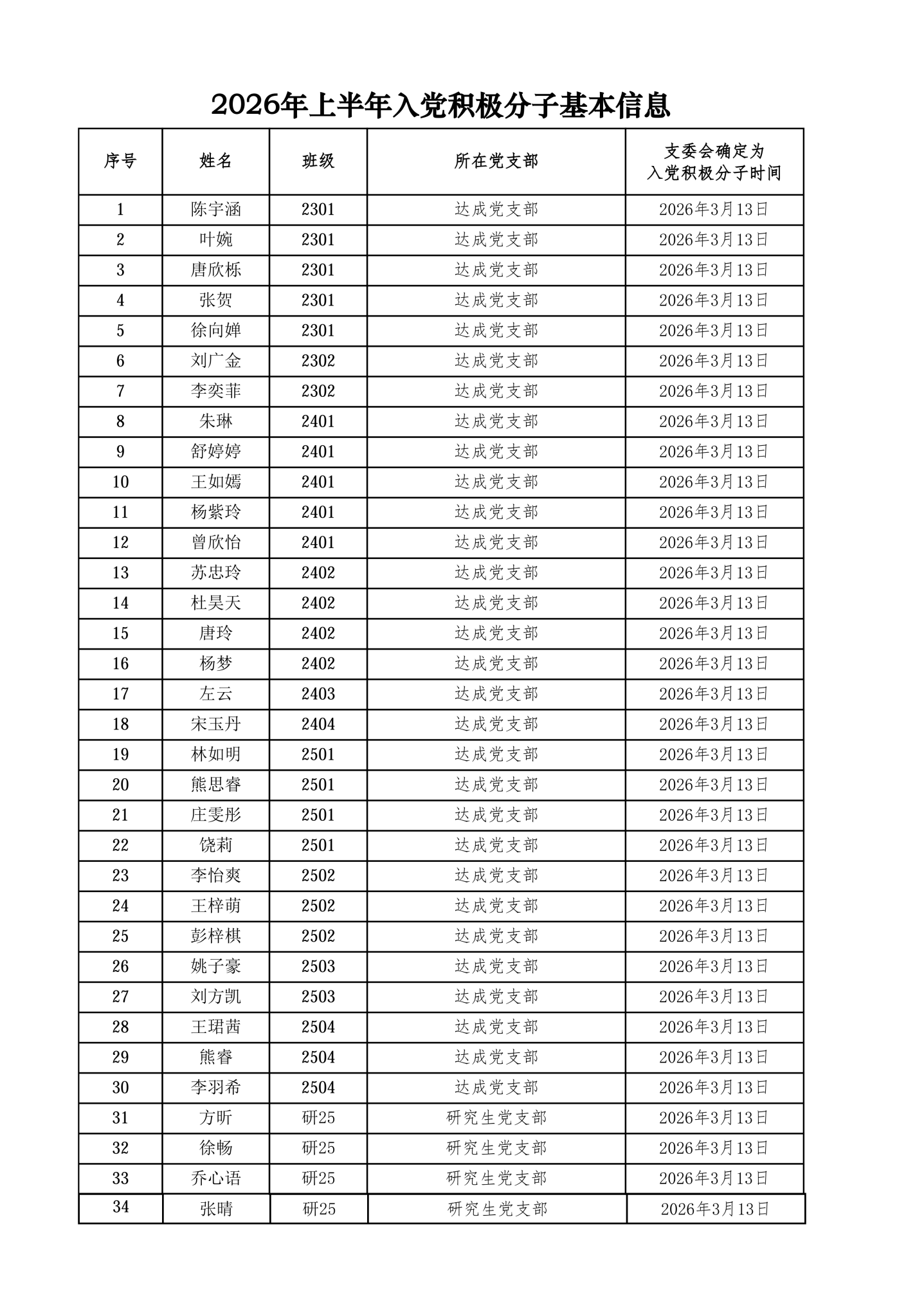 根据《中国共产党发展党员工作细则》、《中共湖北师范大学委员会发展党员工作实施细则》以及2026年上半年入党积极分子发展工作有关要求,经本人申请、群团组织推优,学生党支部委员会讨论研究,拟确定以下34名同志为入党积极分子,现将名单予以公示。